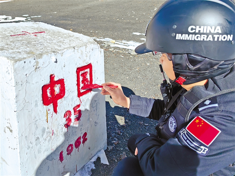 图为日喀则边境管理支队贡当边境派出所民警执行山口巡逻踏查任务,并为界碑描红。本报通讯员 林萧 摄