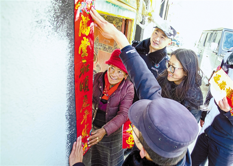 图为日喀则边境管理支队琼孜边境派出所民警来到“结对帮扶”群众家中,与群众一同贴春联、迎新春。本报通讯员 贺烈烈 崔娜 摄