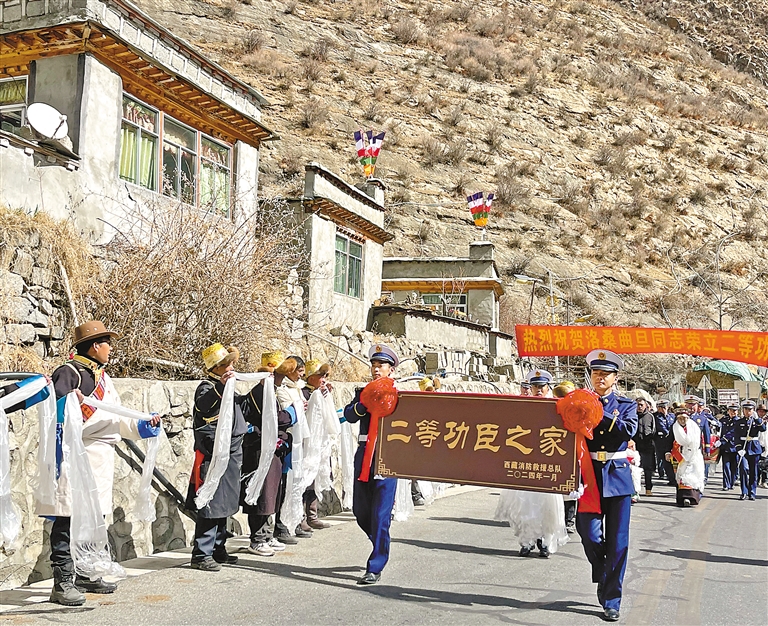 图为锣鼓喧天、热闹喜庆的氛围中,洛桑曲旦身着火焰蓝、胸佩大红花,其家属佩戴“一人立功 全家光荣”绶带,“送奖报喜团”抬着“二等功臣之家”牌匾,拉着“热烈祝贺洛桑曲旦同志荣立二等功”横幅阔步前往洛桑曲旦位于山南市桑日县增期乡达古村的家中。 本报记者 刘琳琳 摄