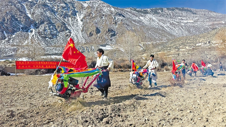 一犁春泥,万顷新绿。2月26日,昌都市八宿县拉根乡烈日村村民身着节日盛装,相聚在农田,进行开耕仪式。伴随着犁地机的“突突”声,平整的土地被犁出一道道垄沟,身穿盛装的村民向地里撒播种子,一幅生机盎然的春耕图徐徐展开。