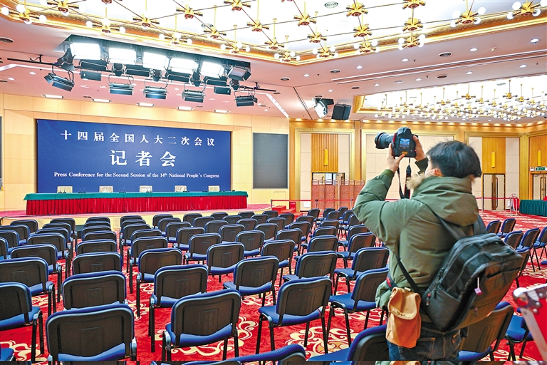 2月27日,在2024年全国两会即将召开之际,设在北京西长安街北侧梅地亚中心的两会新闻中心正式启用。 图为一名记者在两会新闻中心现场拍摄。 新华社记者 李鑫 摄