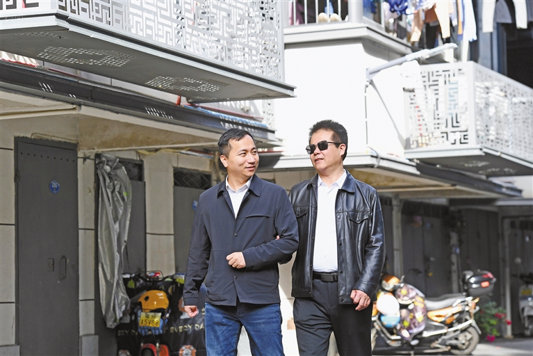 图①:2月18日,王永澄代表(右)在志愿者的协助下前往福州市鼓楼区红墙巷小区调研盲人家庭子女入学及保障房入住情况。