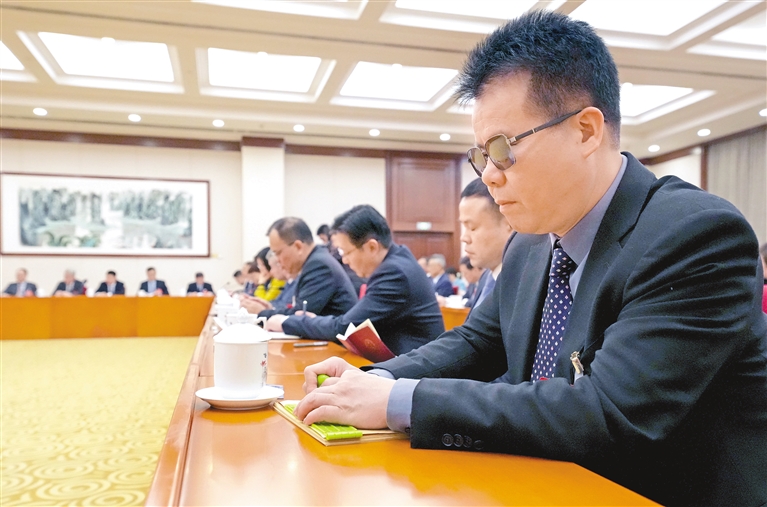 图②:3月6日,王永澄代表(右一)在参加分组审议时用盲文记笔记。