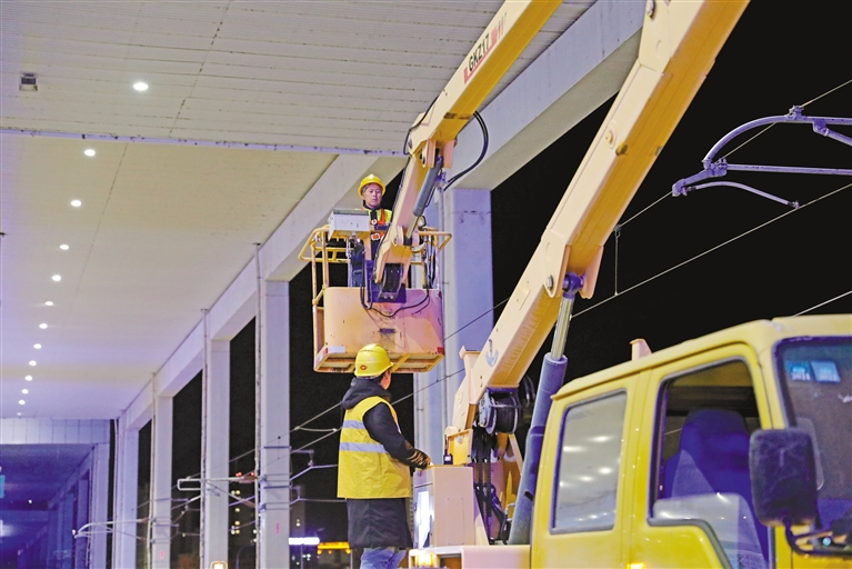 为保障旅客安全出行,青藏铁路拉萨基础设施段利用“天窗”时间,对拉萨火车站站台风雨棚照明设备进行更换。
