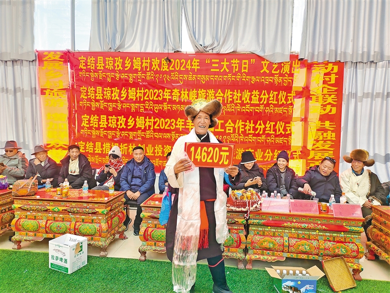 近日,日喀则市定结县琼孜乡姆村奇林峡旅游合作社为村民分红共计100万元。2023年,姆村奇林峡旅游景区接待游客3.85万余人,实现门票收入300.66万元;为当地群众提供就业岗位11个,发放工资总计49万余元。