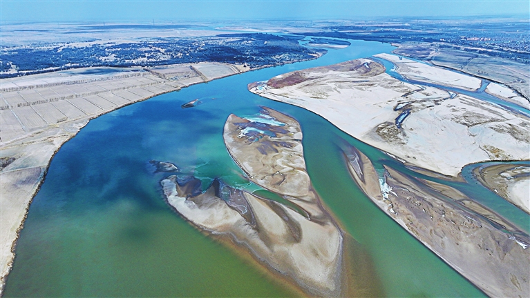 近日,随着气温回升,黄河宁夏段冰凌消融,成群的候鸟在黄河滩涂嬉戏、飞翔,与碧波潋滟的黄河构成一幅生态美景图。 这是3月1日拍摄的黄河宁夏段(无人机照片)。新华社记者 王鹏 摄