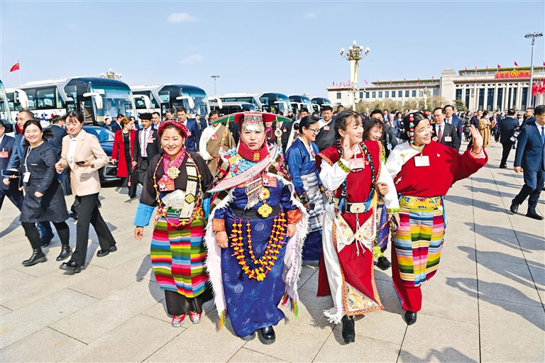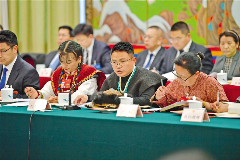 图为我区全国人大代表扎西江村(右)在西藏代表团全体会议上发言。 本报记者 旦增西旦 摄