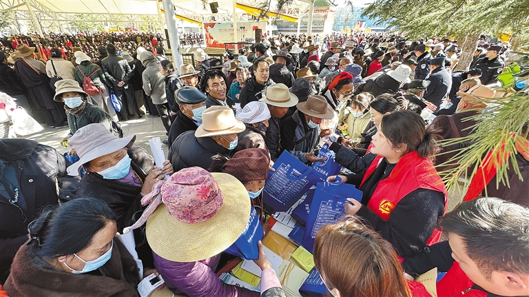 拉萨市直单位工作人员在宗角禄康公园为市民讲解民生政策并发放宣传手册。