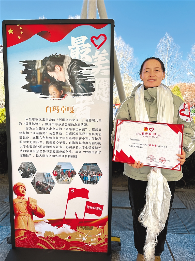 这是荣获拉萨市2023年度“最美志愿者”称号的白玛卓嘎。