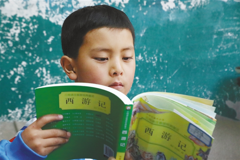 拉萨市第一小学一年级 5 班学生图丹嘉认真阅读同学赠送的课外读物。