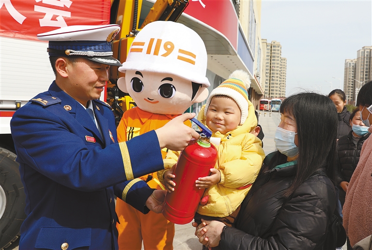 图为3月13日,在江苏省淮安市洪泽区高良涧街道,消防员为市民普及消防产品知识。 新华社发(殷潮 摄)