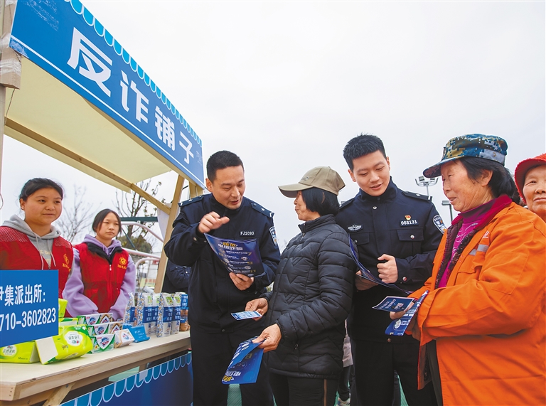 图为3月13日,在湖北襄阳尹集白云广场,民警在“反诈集市”上向市民科普反诈常识。 新华社发(李旭晖 摄)