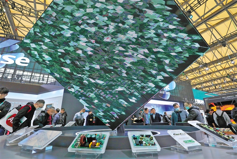 图为3月14日,参观者在海信公司展台上观看电器控制芯片组的展示。新华社记者 方喆 摄