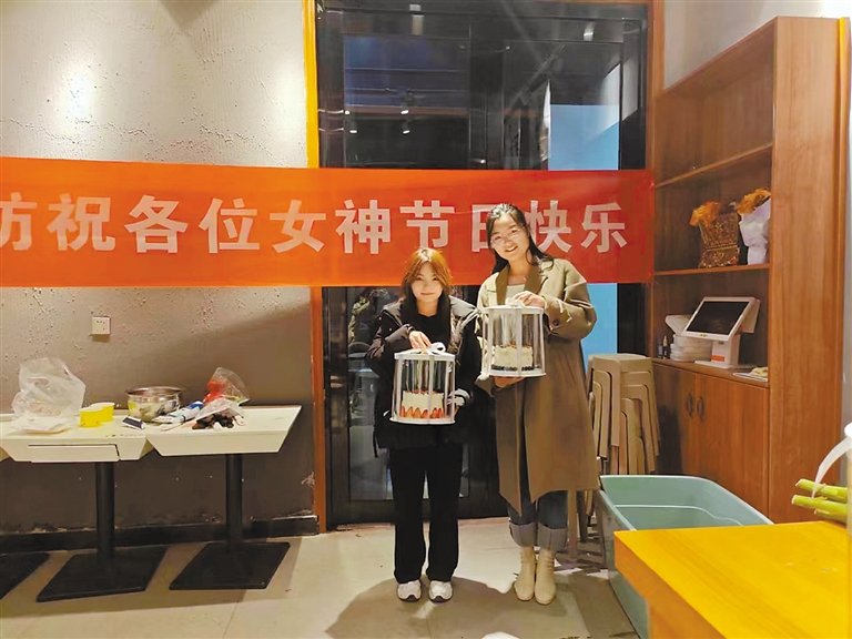 该公司女职工参加DIY烘焙活动,手执自己烘焙的蛋糕合影。 本报记者 卢文静 摄