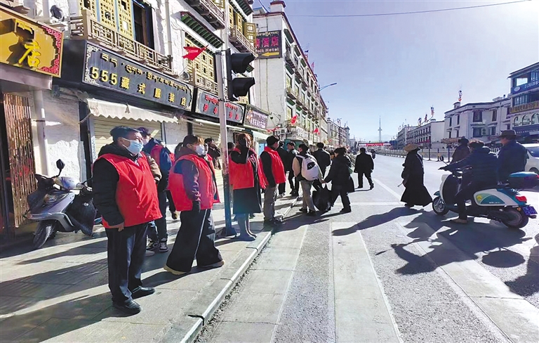 图为志愿者在策门林三巷路口开展文明交通劝导活动本报通讯员 次仁白珍 摄