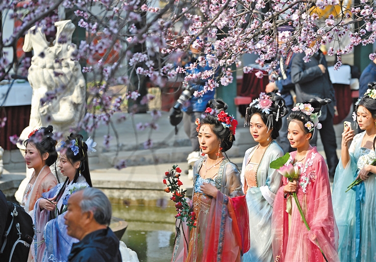 图为3月15日,演艺人员身着汉服在天津桃花堤漫步。