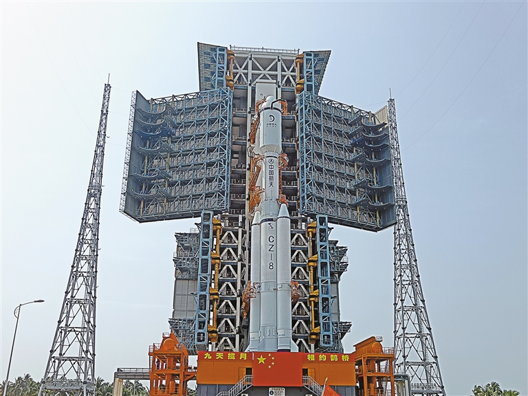 图为3月17日,探月工程四期鹊桥二号中继星和长征八号遥三运载火箭组合体转运至发射区。新华社发(黄国畅 摄)