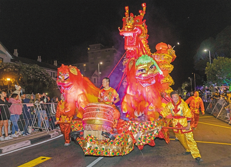 图为3月16日晚,在南非立法首都开普敦,中国方阵的花车参加开普敦狂欢节游行。新华社记者 王雷 摄