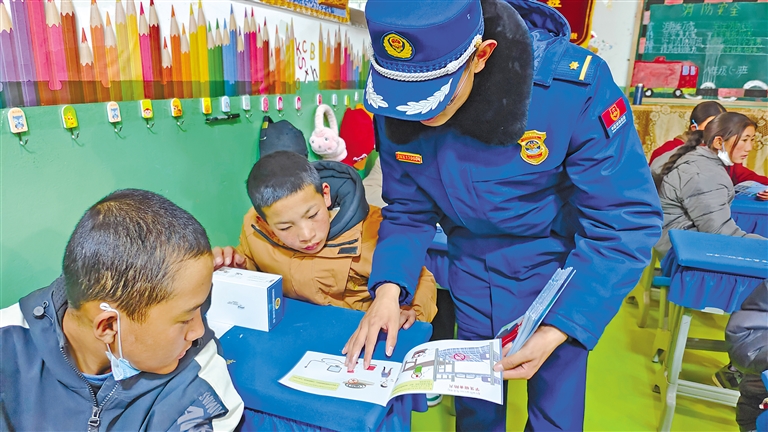 图为消防宣传员走进教室讲解安全知识。