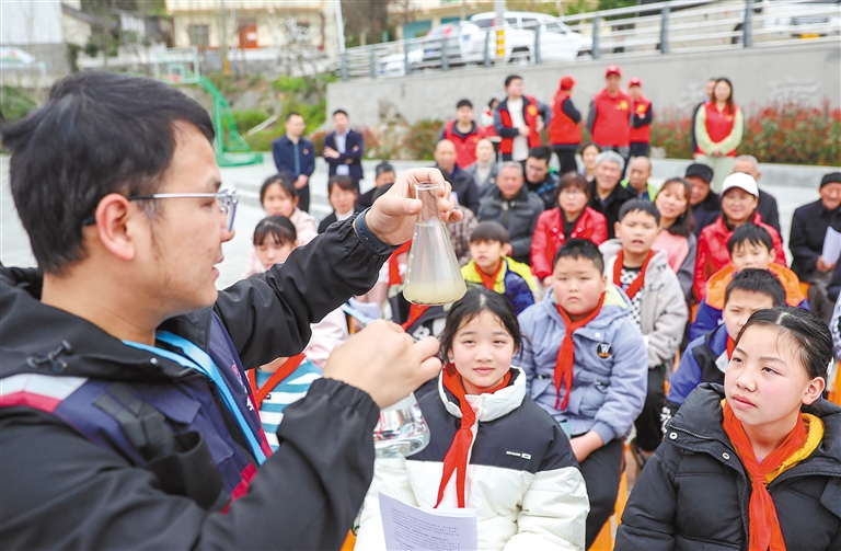 为迎接即将到来的世界水日,各地举办形式多样的主题活动,增强人们的节水护水意识。 图为3月20日,四川省华蓥市疾控中心的志愿者在天池湖畔为学生讲解水质常识。 新华社发