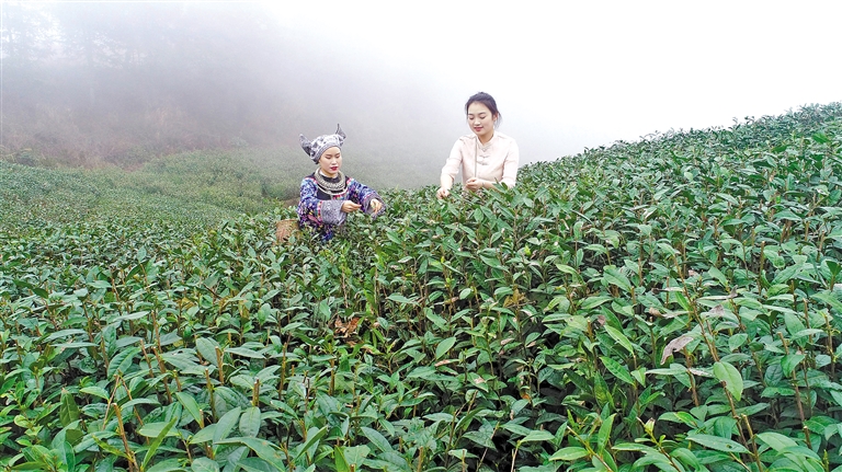 茶农在贵州省黔东南苗族侗族自治州雷山县丹江镇一处茶园采茶(无人机照片)。新华社发