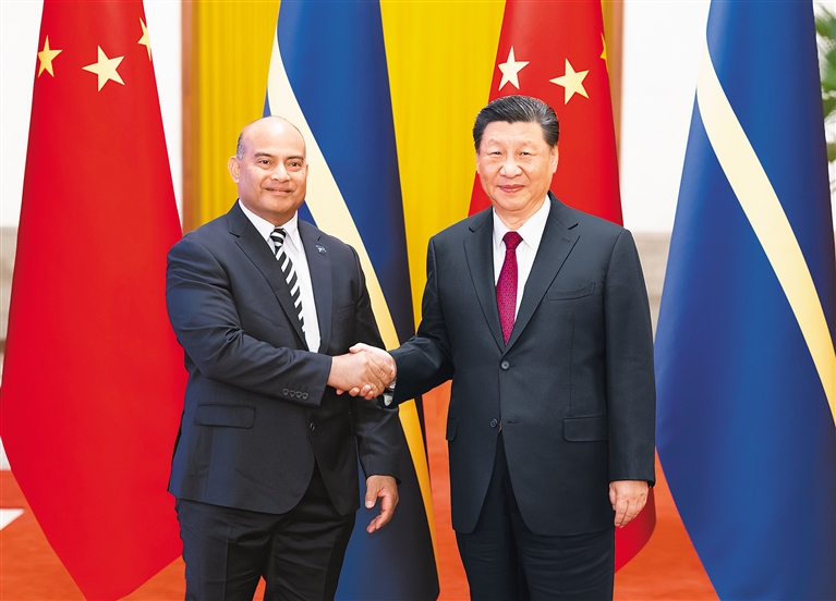 习近平指出,今年1月,瑙鲁作出坚持一个中国原则、同中国复交的政治决断,这是符合历史大势、顺应时代潮流之举。友好不分先后,只要开启,就会有光明前途。合作不论大小,只要真诚,就会有丰硕成果。中瑙关系已经翻开新的历史篇章。中方愿同瑙方一道,开创中瑙关系的美好未来,更好造福两国人民。