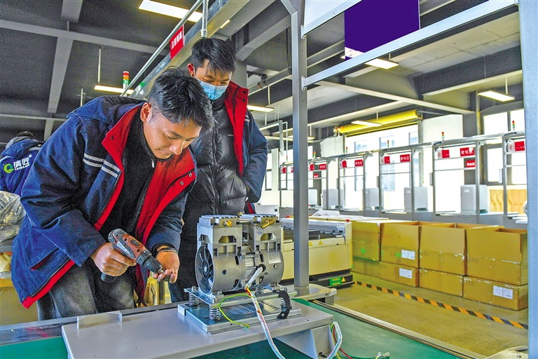 图为山南经济技术开发区内,西藏清匠电器科技有限公司的工作人员在组装制氧机。 本报记者 丹增群培 摄