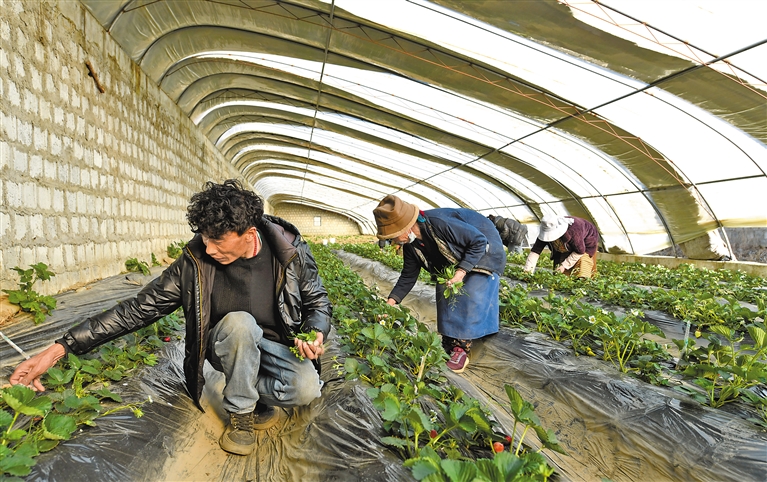 近年来,我区紧紧围绕农业产业结构调整,大力发展设施农业,开辟了一条城郊农业与休闲观光相结合,有一定规模的、效益好的、带动老百姓就业增收的采摘观光新路子,进一步促进农业增效、农民增收。 图为山南市乃东区泽当街道多若社区的草莓大棚中,工作人员在除草。 本报记者 旦增兰泽 摄