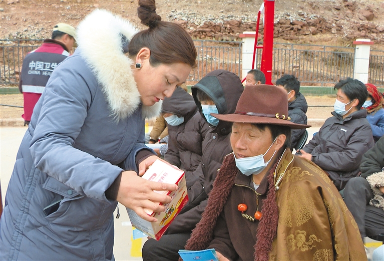 图为工作人员为贡觉县莫洛镇洞托村群众讲解儿童营养包使用时应注意的事项。本报记者 贡秋曲措 本报通讯员 朗加卓玛 摄