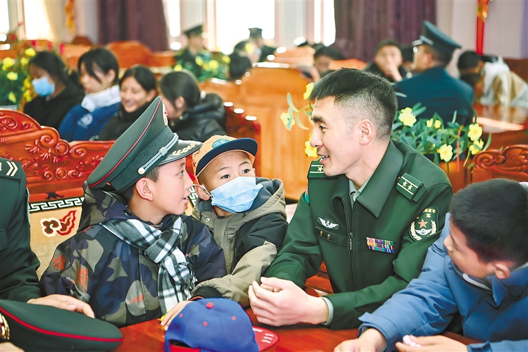 图为官兵与孩子们交流,倾听他们的心声 。蒲津 本报记者 潘多 摄