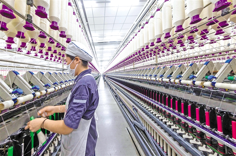 图为3月26日,工人在位于泰州市姜堰区的一家纺织公司智能化生产线上作业。新华社发(汤德宏 摄)