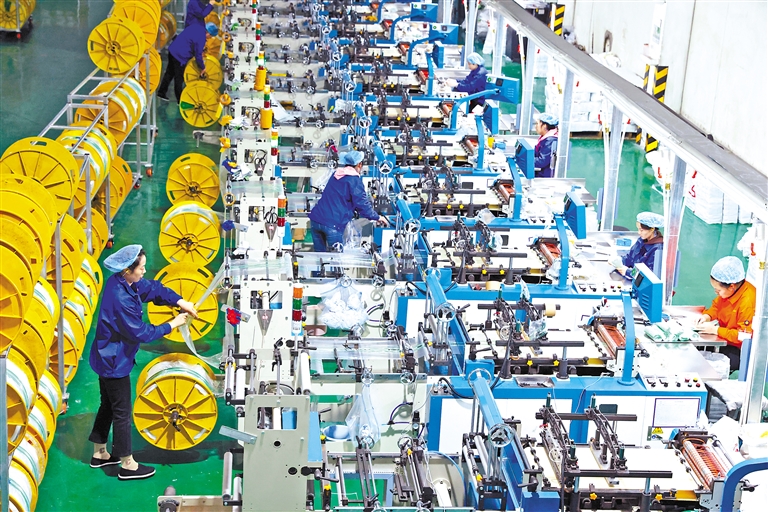 图为3月26日,在浙江省湖州市德清县乾元镇的一家塑料制品公司生产车间,工人在赶制出口的食品保鲜袋订单。新华社发(倪立芳 摄)