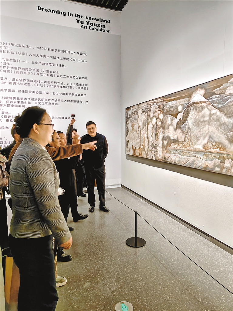 4月1日上午,西藏题材名家展——“雪域寻梦·余友心美术作品展”在西藏美术馆开展。本次展览共展出100幅精品画作,包括“雪域净土”“高原之灵”“天界舞者”“心象意境”四部分,展现了西藏特有的天地大美。 图为市民群众观看展出画作。本报记者 耿锐仙 摄