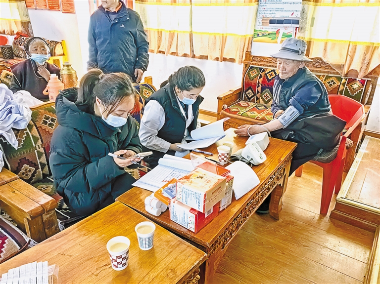 近日,林芝市工布江达县加兴乡加兴村联合乡卫生院开展义诊服务活动。图为医护人员为村民量血压,并详细讲解卫生保健知识。本报记者 王珊 谢筱纯 摄