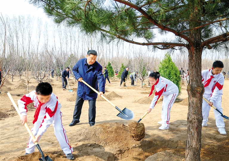 挥锹铲土、培土围堰、提水浇灌……习近平接连种下油松、黄栌、元宝枫、樱桃、红叶碧桃、侧柏等多棵树苗。习近平一边植树,一边询问孩子们的学习生活、劳动锻炼情况。他强调,广大青少年是祖国的未来,从小要积极参加劳动、植树造林,把绿色的种子种进心里,养成尊重自然、热爱自然的意识,勤奋学习、锻炼身体、茁壮成长,德智体美劳全面发展,努力成为国家栋梁。植树现场一派热火朝天的劳动景象,领导同志们同大家一起培土浇水,气氛热烈。