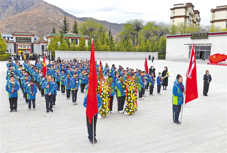 图为西藏军区拉萨八一校师生在烈士陵园向英雄致敬。 本报记者 旦增兰泽 摄