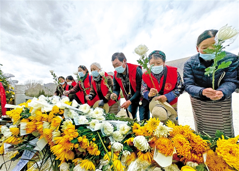 图为拉萨市八朗学社区居民代表向烈士纪念碑献花。 本报记者 白玛泽旺 摄