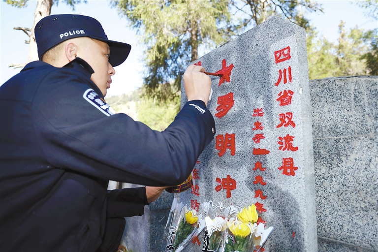 图为亚东出入境边防检查站民警为革命烈士墓碑描色。 李锦辉 摄