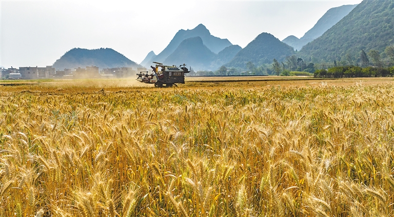 ▲4月4日,农机手在云南省文山壮族苗族自治州丘北县八道哨村的麦田里驾驶联合收割机收割小麦。 新华社发