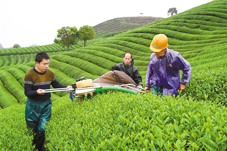 ?4月4日,浙江省武义县壶山街道正新屋村茶农用采茶机在茶园赶采春茶。 新华社发