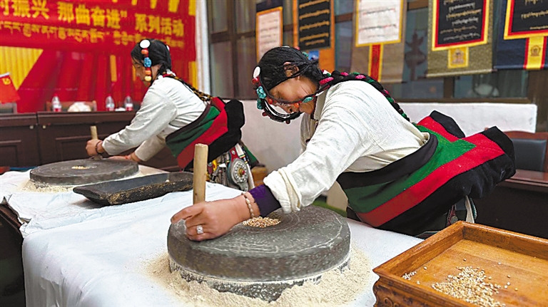 在第三届“乡村振兴 那曲奋进”农牧民技能大赛中,巴青县农牧民参赛选手进行手工磨糌粑。 本报记者 万靖 摄
