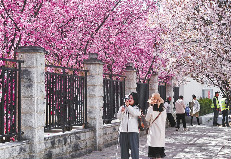 图为市民、游客在拉萨军民路赏花。本报记者 唐斌 摄