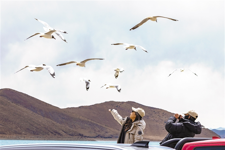 图为游客在羊卓雍错岸边与棕头鸥合影。新华社记者 姜帆 摄