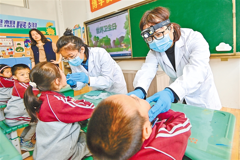 在山东省青州市宏德小学,医护人员为学生检查牙齿。 新华社发