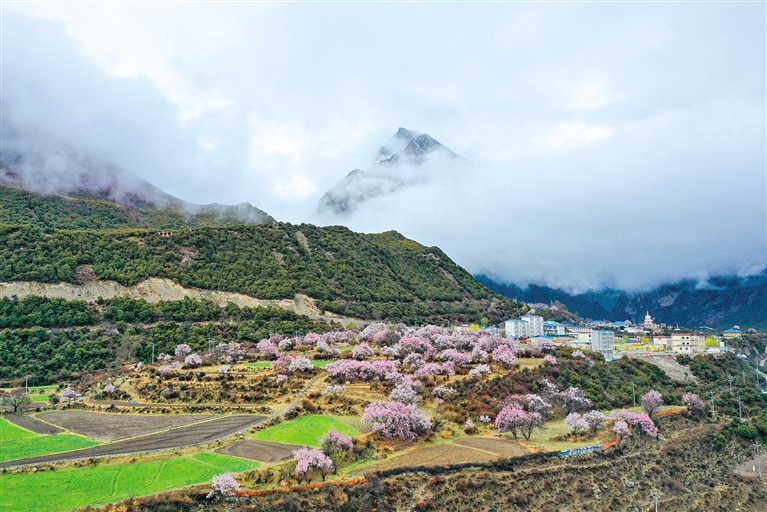 人间四月,春色正浓。在那曲市嘉黎县尼屋乡,易贡藏布两岸的山坡上,粉红、粉白的桃花连片绽放,灿若云霞。