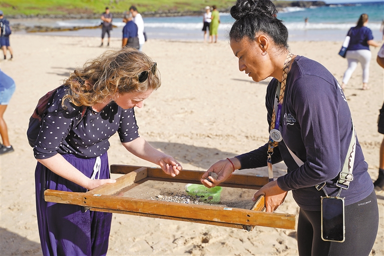 图为4月5日,在智利复活节岛,一名游客(左)与当地志愿者一起进行海滩清理工作。新华社记者 朱雨博 摄