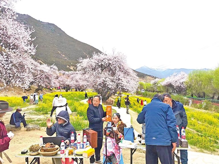 林芝市职业技术学校学生在嘎拉村直播,宣传推介桃花旅游文化节、工布民俗风情及农特产品等。 本报记者 谢筱纯 王珊 摄