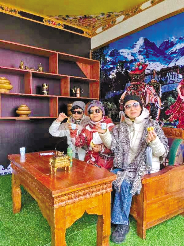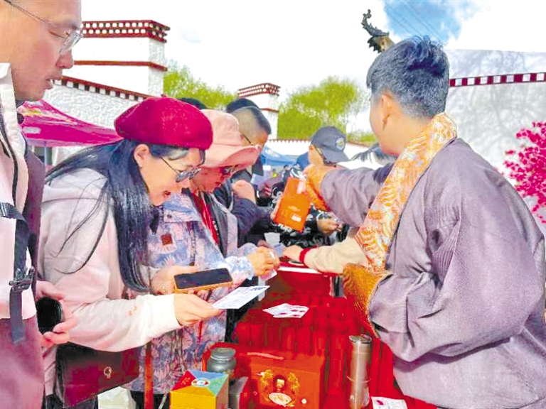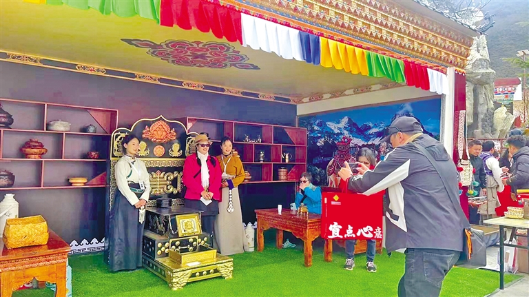 游客在“次仁的家藏式体验馆”区域拍照打卡集章。
