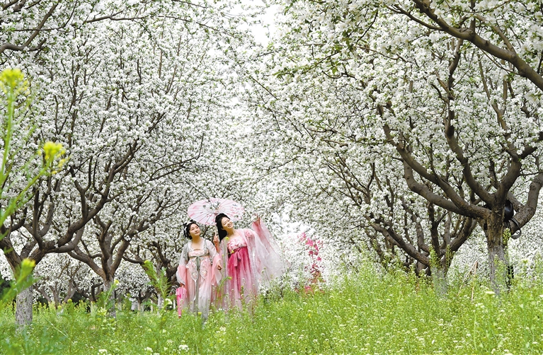 图为4月8日,游客在河北省邯郸市峰峰矿区义井镇万亩秀林的海棠林里游玩。