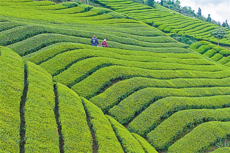 贵州:4月8日,茶农在贵州省黔东南苗族侗族自治州岑巩县思旸镇岑峰村生态茶园采摘春茶。新华社发(万再祥 摄)